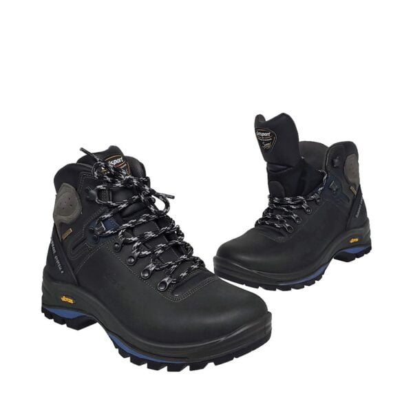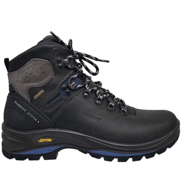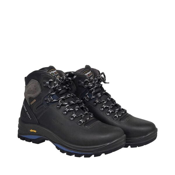 Μποτάκια της ιταλικής εταιρείας Grisport, σε μαύρο χρώμα, εξωτερικά κατασκευασμένα από εξαιρετικής ποιότητας δέρμα λαδιού, με αδιάβροχη και διαπνέουσα μεμβράνη Gritex, πολύ ελαφρύ ορειβατικό μποτάκι, με σύστημα απορρόφησης κραδασμών, υψηλής ποιότητας δέρματα λαδιού, και μαλακή σόλα Vibram με ανάποδες κόντρες. Σόλα κατάλληλη για όλα τα εδάφη
